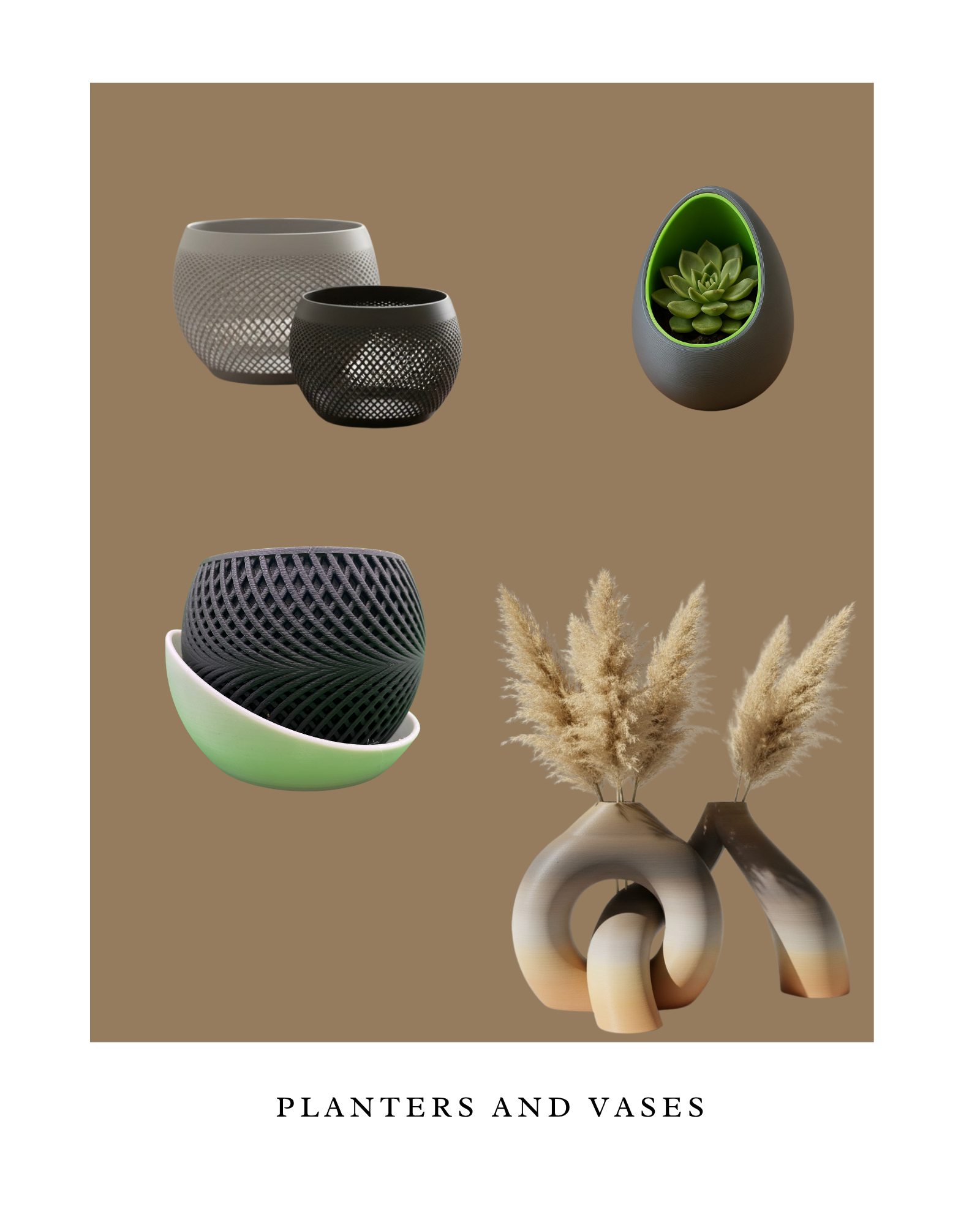 Stylish 3D printed planters and vases designed to elevate any space. From modern geometric patterns to organic shapes, these pieces bring a clean, contemporary look to your home or office.